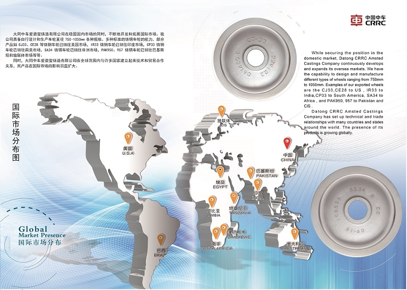 大同中车爱碧玺铸造有限公司在稳固国内市场的同时,不断地开发和拓展国际市场,我公司具备自行设计和生产车轮直径750~1050mm各种规格,各种标准的铸钢车轮的能力,部分产品如CJ33,CE28等铸钢车轮产品已进入美国市场,IR33铸钢车轮进入印度市场,CP33铸钢车轮进入南美市场,SA34铸钢车轮已销往非洲市场,PAK950,957铸钢车轮已销往巴基斯坦和独联体市场 午夜黄视频。