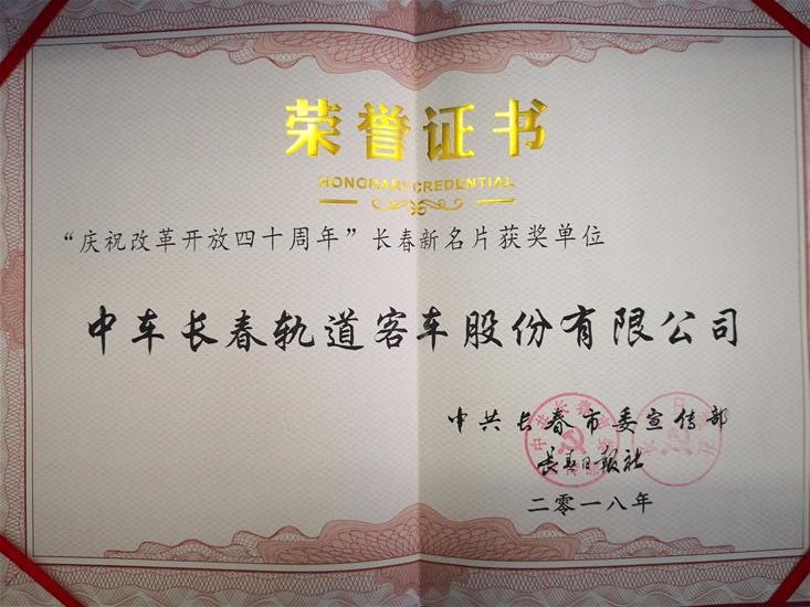 2018年12月,公司在长春市改革开放40周年“长春新名片”颁奖仪式上荣获“长春新名片”荣誉称号
