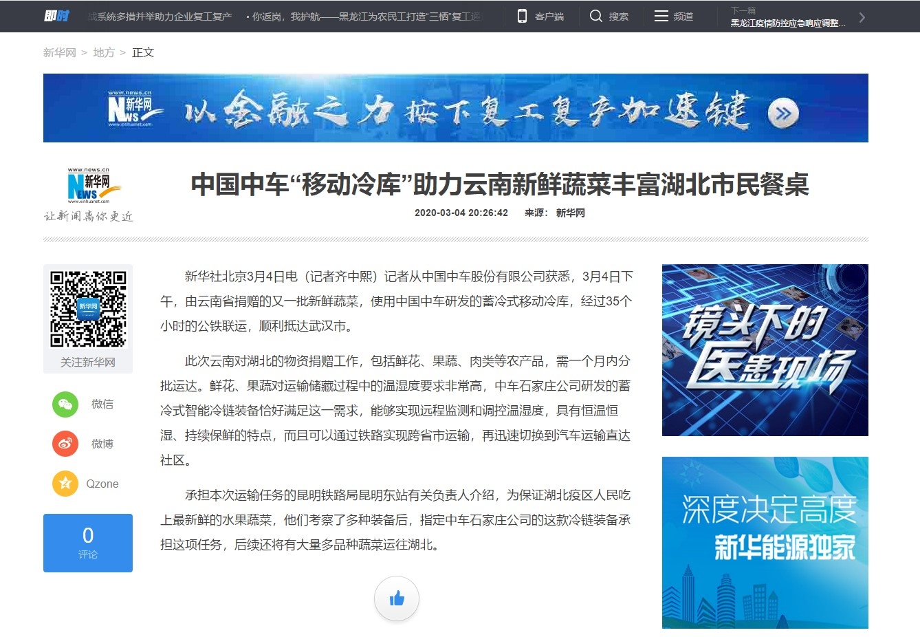 新闻营销集中发力,2月17日,公司驰援武汉物资运输的8个“移动冷库”装车发往云南,公司领导果断决策——抓住契机开展新闻营销,新闻记者迅速出击,实时跟踪驰援动态,统计运输数据,沟通新闻媒体,随着甘蓝,黄瓜,番茄,沃柑,罐头,鲜花等共10个批次124吨民生物资陆续运抵武汉,咸宁等地,《中车移动大冷库为抗“疫”物资保鲜》《一路向北三千里,我把春天送给你》《中国中车“移动冷库”助力云南新鲜蔬菜丰富湖北市民餐桌》等即时报道先后在新华网,工人日报,科技日报,中新网,中国铁路网等10余家国家,省,市级媒体刊发,“移动冷库”恒温恒湿,深度保鲜的优势越发突显 成年人午夜网站,为公司蓄冷式智能冷链装备打开市场,迈向产业化运营打下了良好基础,新闻营销取得明显成效。