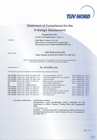公司设计研发的《CWT系列风力发电机组》先后通过了TUV-A级设计认证(为国内首家通过A级设计认证的机型)及中国船级社 午夜黄视频,鉴衡认证中心等国内外权威认证机构的认证。