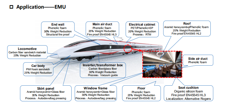 Advantages: Compared with the traditional aluminum honeycomb roof panel, the areal density of fiber reinforced phenolic foam roof panel <4.8kg/㎡, loading practice shows that the actual weight loss reaches 27.1%; thermal insulation effect is more obvious, with thermal conductivity 0.079W/(m.K), there’s no need to use the thermal insulation cotton; sound insulation amount reaches 24dB (8mm thickness); to meet the requirements of the European Union banned substances to meet the EN45545-2 HL2 level material fire protection.